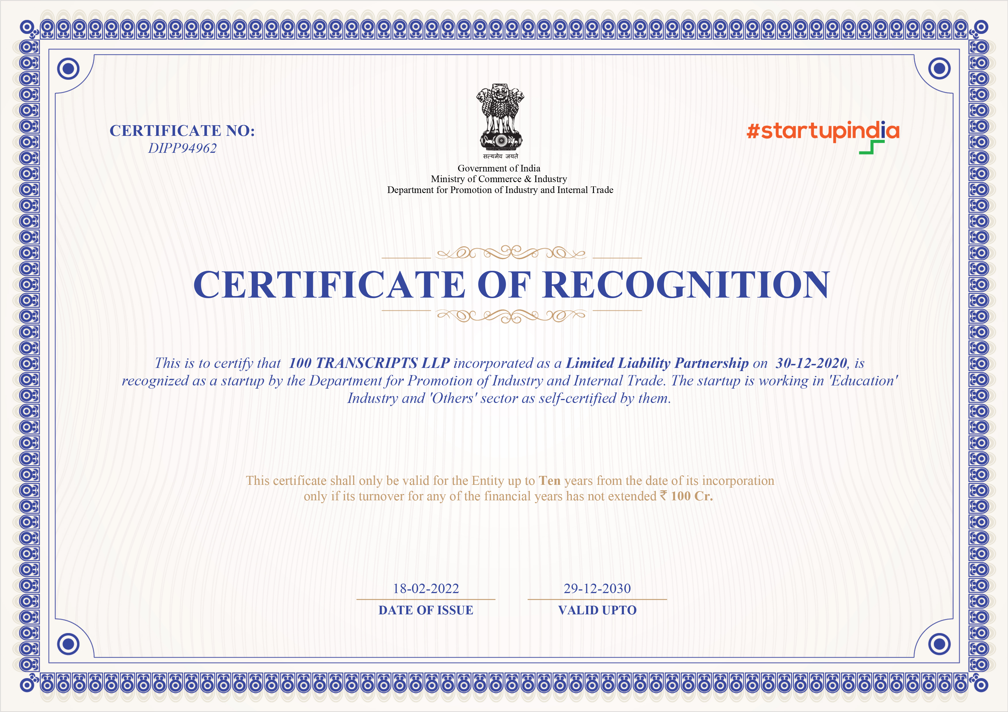 StartupIndia Recognition: